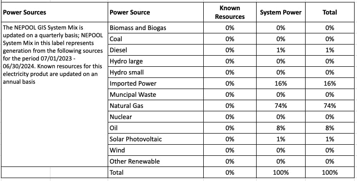 The electricity you consume comes from the New England power grid, which receives power from a variety of power plants and transmits the power throughout the region as needed to meet the requirements of all customers in New England. When you choose a power supplier, that supplier is responsible for generating and/or purchasing power that is added to the power grid in an amount equivalent to your electricity use. Known Resources include resources that are owned by, or under contract to, the supplier. System Power represents power purchased in the regional electricity market. Biomass refers to power plants that are fueled by wood or other plant matter. Hydro resources of greater than 30 megawatts in size are deemed “large hydro.” All other hydro resources are deemed “small hydro.” Other Renewables include fuel cells utilizing renewable fuel sources, landfill gas, and ocean thermal.